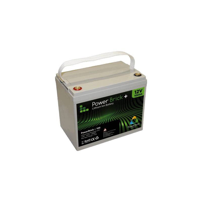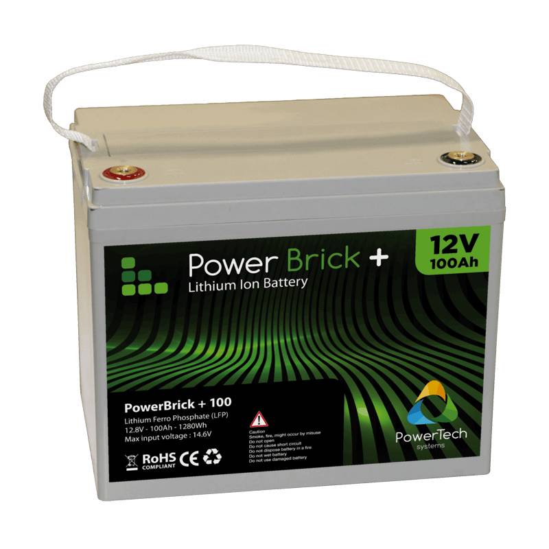 The PowerBrick+ Lithium battery 12V-100Ah has a nominal voltage of 12.8V. It can be easily assembled in series (up to 4 batteries in series) and in parallel (up to 10 batteries).