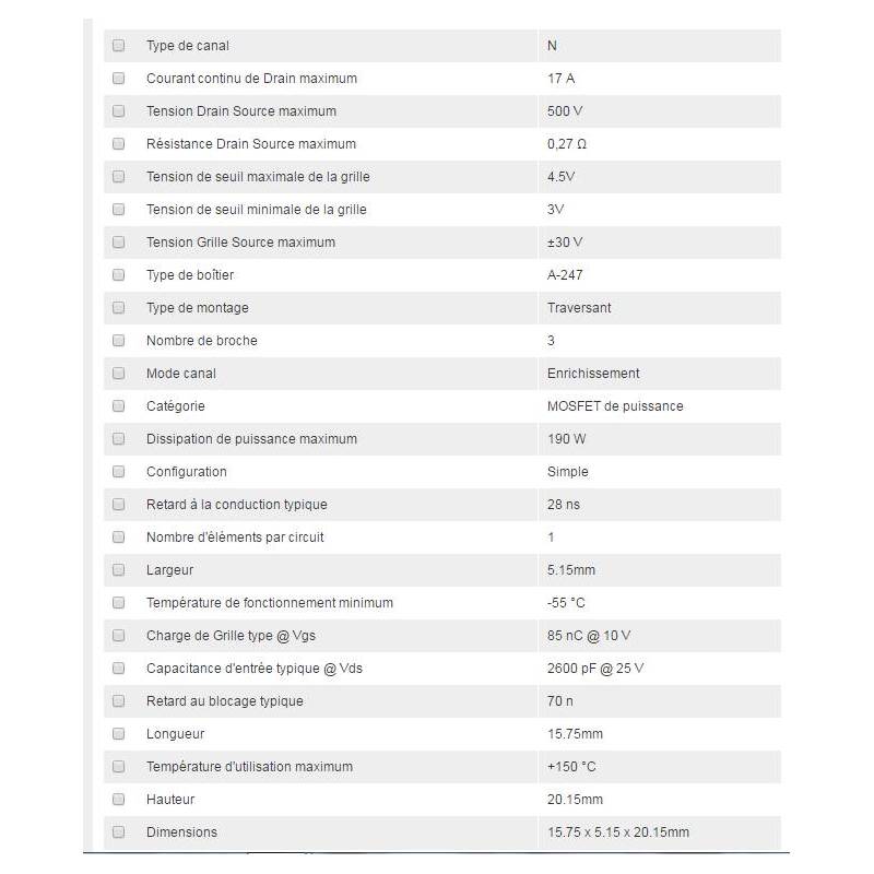 MOSFET N chanel transistor 17A 500V A-247 W20NK50Z model STW20NK50Z