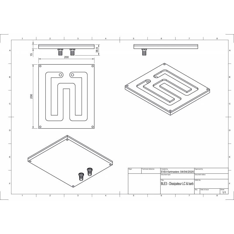 Heatsink with liquid cooling of heat for Zapi ACE4 et BLE4 controllers Include Alimunium water plate + black caoutchouc join Dimentions 204 mm x 235 mm x 17 mm (without inlet/outlet barb) 4-pass of 20mm x 5mm for liquid cold plate Brass input / ouput barb for hose diameter : 10mm Max recommanded liquid flow 10l/min Thermal resistance 0,03°C/W