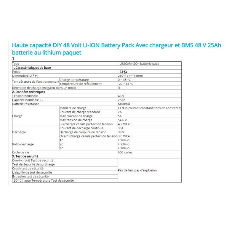 Batterie Lithium-ion pack 48V 25Ah avec BMS intégré et chargeur