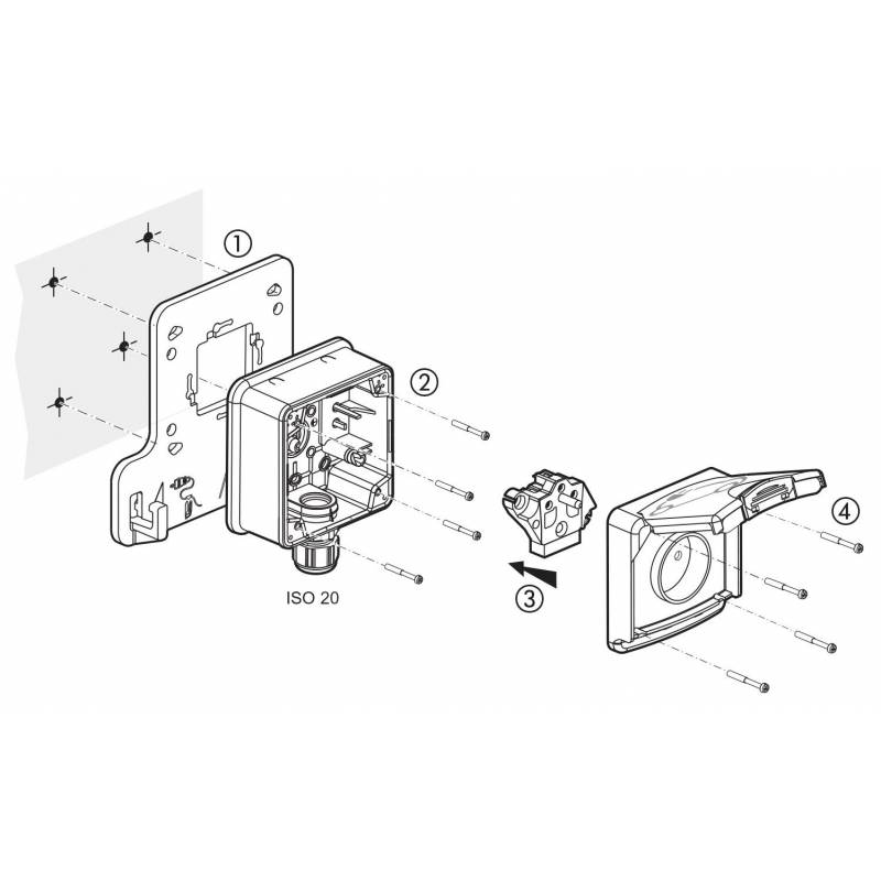 Kit prêt à poser Green'up Access pour véhicule électrique, contenant une prise de courant saillie, une patère et un disjoncteur différentiel