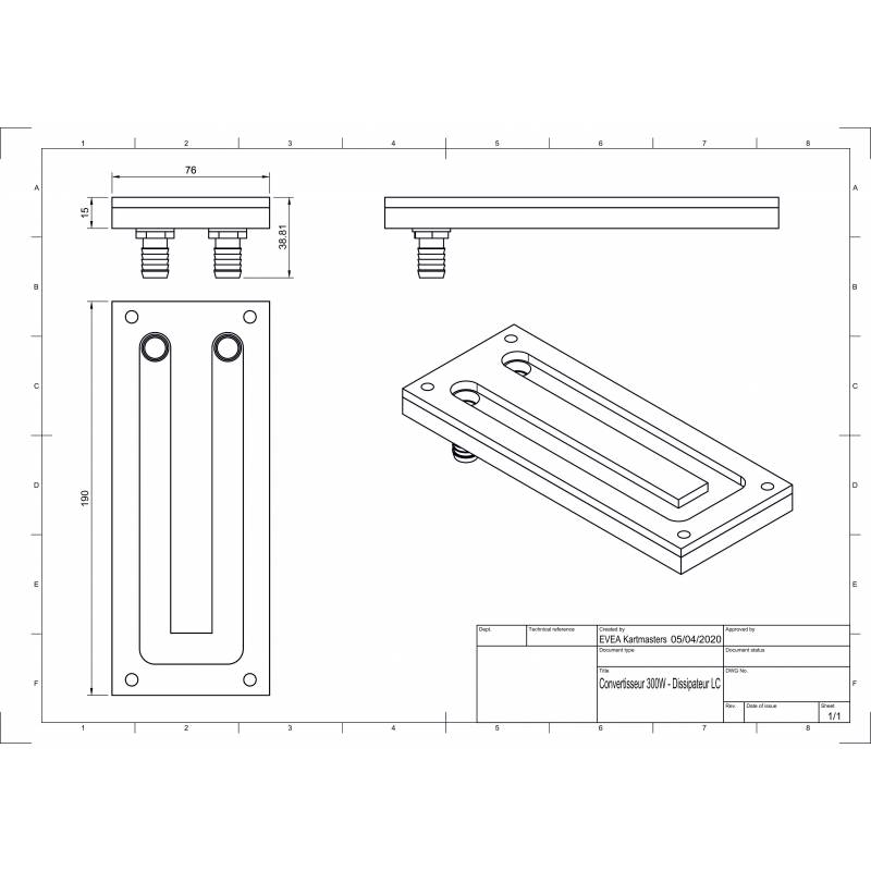 Dissipateur à refroidissement liquide pour variateur Zapi ACE2 Gen2 et BLE2 Gen2. 4 canaux tubes de 20mm x 5mm Raccord laiton diam. 10mm Plaque à eau aluminium + joint caoutchouc noir Dimensions 200 mm x 150 mm x 17 mm (hors raccords entrée/sortie) Diamètre durites entrée/sortie 10mm Flux liquide recommandé max 10l/min Résistance thermique 0,03°C/W