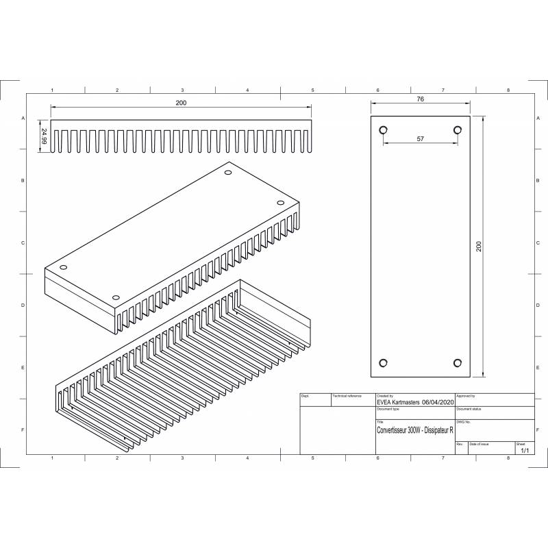 Dissipateur à refroidissement air pour variateur Zapi ACE-0, BLE-0, ACE-2 Gen2, BLE-2 Gen2. 29 ailettes Radiateur aluminium + pâte thermique Dimensions 200 mm x 150 mm x 25 mm Fixation du variateur par 4 vis M6 Résistance thermique 0,5°C/W
