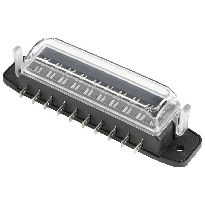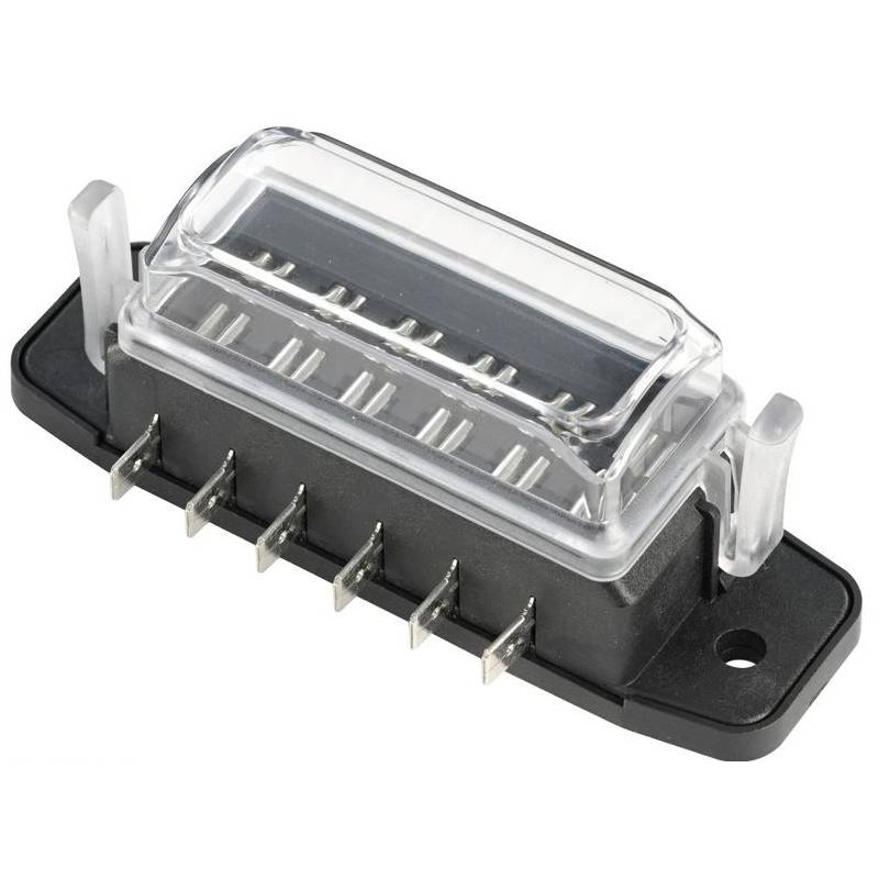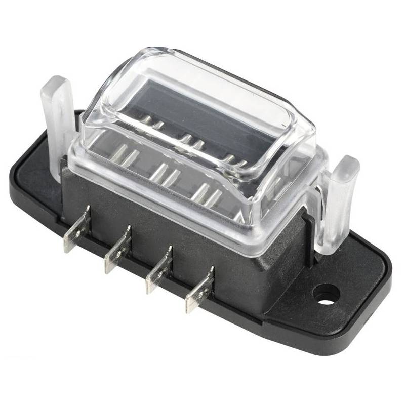 Porte fusible étanche automobile pour fusible à languette enfichables Compatible avec fusible de type APM/ATM 32V Disponible en 4, 6, 8 et 10 emplacements Voies indépendantes et isolées Courant max. par voie 40A Couvercle transparent avec joint d'étanchéité. Fixation de la boite à fusible par 2 vis M5 Normes SO 8820, SAE J 1284, DIN 72581, UL 248,...